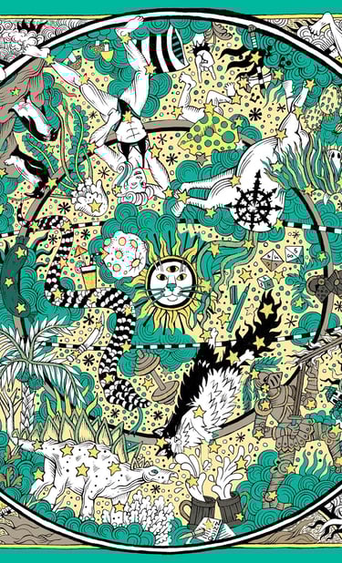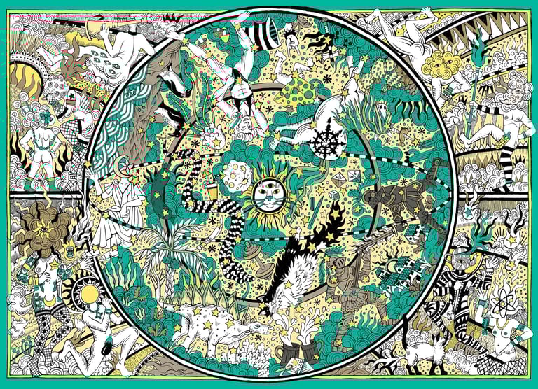 Agathe Pitié est une dessinatrice et illustratrice dont le style est très influencé par l'enluminure moyen âgeuse et la miniature indienne, on pense à Jérôme Bosh pour le foisonnement de personnage.